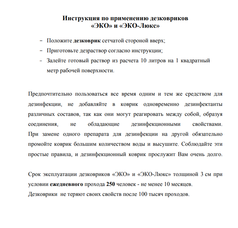Также дезинфекционные коврики могут применяться для обработки копыт животных, колес тележек, каталок, автошин.