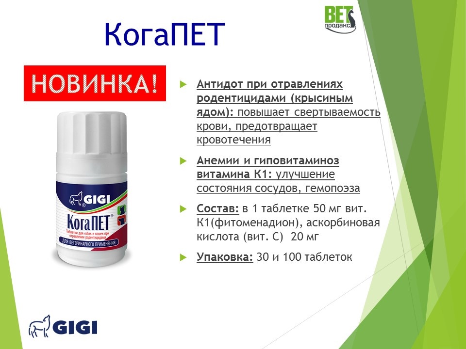 Препарат КогаПет применяют собакам и кошкам в качестве антидота при отравлении родентицидами (крысиным ядом) из группы антикоагулянтов, а также при анемии и гиповитаминозе К1.