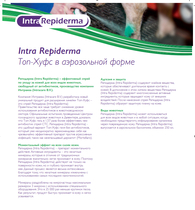 Intra Repiderma (Интра Репидерма) – эффективный спрей по уходу за кожей для всех видов животных, свободный от антибиотиков, в составе которого действующими веществами являются хелатные соединения минералов цинка и меди, которые проникают в кожу гораздо легче, чем обычные минералы.